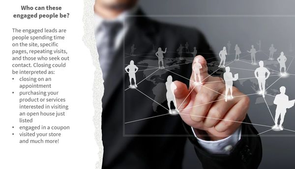 The engaged leads are people spending time on the site, specific pages, repeating visits, and those who seek out contact. Closing can mean: closing on an appointment, purchasing your product or services, wanting to go visit an open house listed on your website, engaged in a coupon, visited your store, and much more!